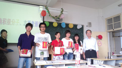 比赛过程中还颁发了“英语角积极分子”奖,他们分别是10城规班刘巍、09会计2吴乾晟、周超、09会计1班朱曾佳、10建筑4班赵洪岩、10会计2班张佳佳。还有6位同学被评为“英语角优秀志愿者”,他们是10报关班潘先君、胡瑞琪、10建筑2班孙潇潇,10建筑1班汪庆、10金融班赵维丽、10商务英语班屈晶。现场还抽取了5名幸运观众。