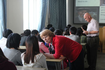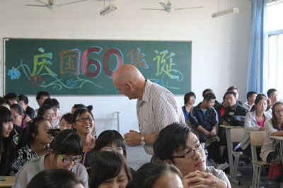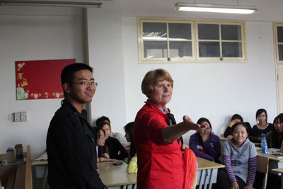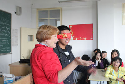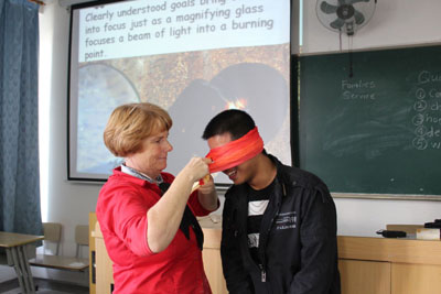 最后外教夫妇请志愿者做了一个蒙着眼睛去寻找目标的游戏。当时Paul站在教室最后充当终极目标,Geil在中间设置了很多障碍,分别代表实现目标所需要付出的努力和前进道路上所要经历的坎坷,由一位老师做向导用口令指引这位志愿者走向终极目标。当志愿者通过重重坎坷到达终极目标与Paul握手时,同学们爆发出了热烈的掌声,在这过程中大家学会了挑战和应该如何找到目标。