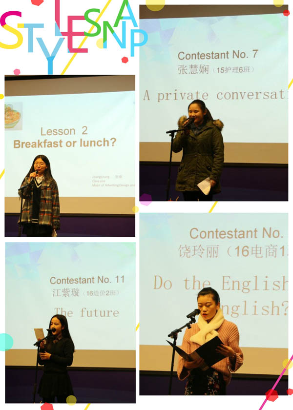 时钟转到十二点半,比赛准时开始。此次活动的主持人由朱小燕与张诗华同学担任。她们先用流利的英语介绍比赛,接着再用中文翻译一遍,使同学们可以在学到英语的同时不会有听不懂的部分。