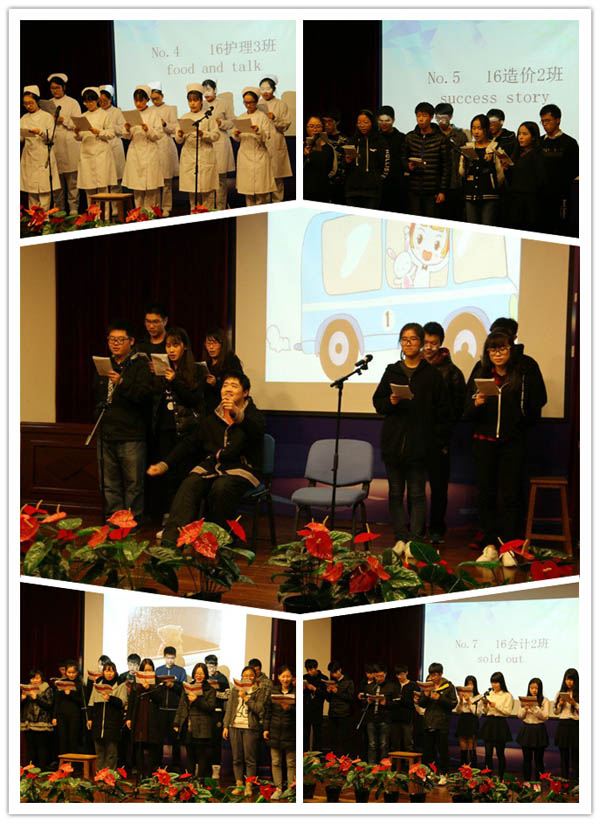 先开始的是个人朗诵比赛。比赛进行得热火朝天,同学们个个有声有色,声情并茂,深深吸引了在场的观众。紧接着是团队朗诵,同学们流利有序的朗读和高涨的热情赢得了观众震耳欲聋的掌声,果然进入决赛的同学们都不简单啊!使人记忆最深刻的是16报关班的表演了,他们男女错开,各站一排,充分发挥他们的想象力,将文章里的内容结合肢体语言以小剧场的方式展现出来,表演十分到位,表情真实有趣,惹得台下观众们捧腹大笑,真是让人回味无穷啊!