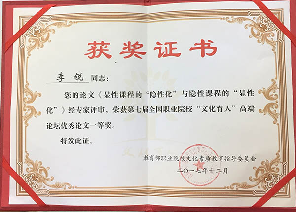活动得到全国职业院校的积极响应,经各校评选,共推荐报送论文298篇。我校基础部李锐老师的论文《显性课程的“隐性化”与隐性课程的“显性化”》脱颖而出,被专家评审为一等奖。