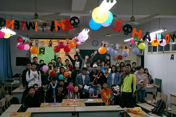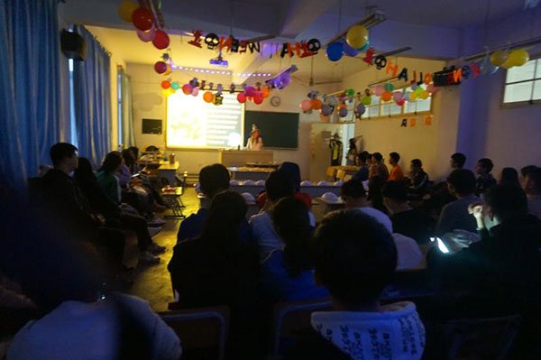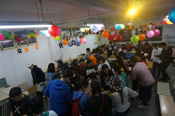 2018年10月30日下午5点,教学楼214教室挂满了南瓜气球、骷髅彩旗、等装饰品,暖黄色的灯光下,一年一度的万圣节英语角活动在此举行。基础部公共英语教研室的老师、外教老师与来自不同院系的60多名同学参加了此次活动。