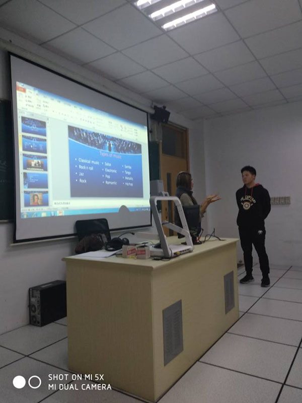 今天的主题是音乐,Mafe老师用流利的英语为大家介绍了西方音乐文化,并与现场的同学们交流互动。因为前几次的亲切互动,同学们已经把Mafe当成了朋友,所以当她提问时,大家从最初的害羞变成了抢着回答。Mafe还用流利的英语介绍了自己学乐器的过程和点点滴滴,并不断鼓励同学们表达自我,使大家认识到其实口语并不难,主要在于敢不敢说。