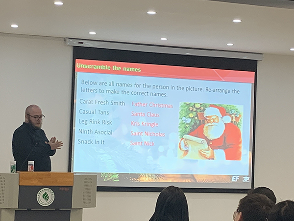第一小组首先选择了Christmas Food。同学们根据ppt上展示的圣诞食物、国家名和图片进行匹配。对于很多同学来说,这个topic不是太难,在小组成员的共同努力下,大家都找到了正确的匹配。接着是圣诞歌曲环节,大家听着圣诞歌曲填入所缺的歌词。同学们屏住呼吸,竖起耳朵,伴随着音乐的柔美旋律,尽力地在一句句歌词中捕捉缺失的单词。第三个环节是Christmas People。Paul在ppt上把圣诞老人的各个表达字母顺序打乱,让同学们将字母重新还原出来。对大多数的中国学生来说,可能对圣诞老人的表达仅限于Santa Claus和Father Christmas两个,所以很多小组都没有猜出正确表达。其实除了大家熟悉的那两个表达以外,圣诞老人还可以被称为Kris Kringle,Saint Nicholas和Saint Nick。最后是Christmas Quiz环节,Paul给出了一些说法,让大家猜测是正确的还是错误的。通过该环节,同学们对于Christmas这个重要的西方节日有了更深一步的理解。