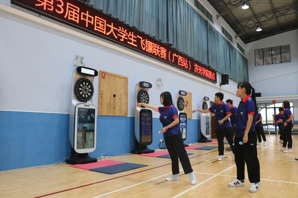 2021年10月16日、17日,由基础部体育教研室孟凡涛、秦磊刚老师带队,我校飞镖队参加了第3届中国大学生飞镖联赛(广西站)的比赛。本次比赛由中国大学生体育协会主办、康湃思(北京)体育管理有限公司协办、广西民族师范学院承办,北京爱镖体育文化有限公司独家运营。25所来自全国各省市的代表队,共计390多名选手参加了比赛。由于疫情等方面的原因,本次比赛采取线上云的比赛方式,各参赛队在本校通过爱镖飞镖机的联网对战功能实时对战。