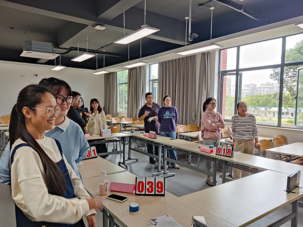 复赛和决赛均以现场问答形式进行,题型有必答题、抢答题、自由选择模块、风险题等,内容涵盖天文、地理、哲学、文学、历史、艺术、民俗等各方面。比赛现场十分精彩。在复赛中,学前系队三位同学团结合作,一直遥遥领先,护理2队、经管3队等其他队伍则不分伯仲,分数十分接近。在复赛最后的风险题模块中,原本排名靠后的建工系队一举拿下全场最后一题,在最后一刻逆势淘汰经管3队,以黑马之姿冲入了决赛。在决赛现场,为使更多同学参与到本次比赛中来,特地设立了“现场协助”环节,每支队伍有两次向现场观众寻求帮助的机会,决赛队伍均组织了自己的亲友团来到现场,其中尤以学前系队的声势最为浩大。随着赛程的进行,比赛气氛逐渐升温,各队均紧密配合、仔细思考考题和竞赛策略。在亲友团的助威下,学前系队保持了在复赛中的强大实力,并恰当使用了求助机会,最后以领先第二名20多分的优势夺得比赛第一名,建工系队位列第二名,护理2队获得第三名。决赛结束后,基础部副主任滕永青、应用文写作教研室主任姜黎黎和教师周梅馨为获奖队伍颁发了荣誉证书并进行了合影。