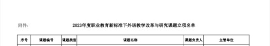 2023年11月1日,教育部职业院校外语类专业教学指导委员会公布了2023年度职业教育新标准下外语教学改革与研究课题立项的通知,我校基础部徐茜老师带队申报的《混合式教学视阈下高本贯通专业英语课程教学研究》获得了重点课题的立项。