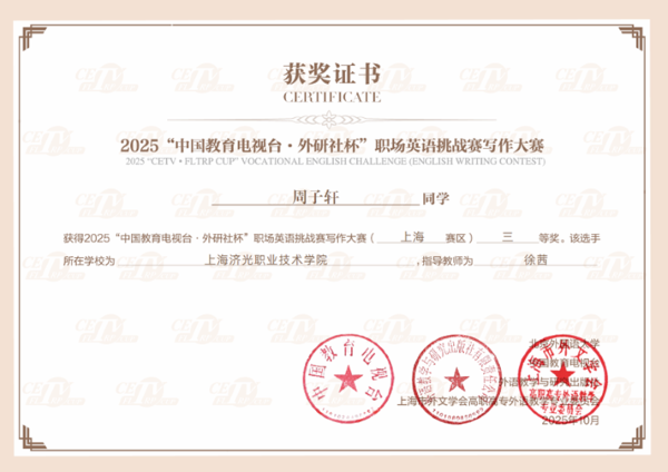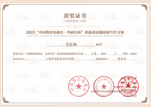 赛前,我校英语教师杨丹凤、徐茜对参赛的同学们进行了一对一辅导,有效提升了学生们的思辨能力和写作能力。在两位老师的悉心指导下,参赛学子们在大赛中奋力拼搏,最终25护理1班赵子澄同学荣获上海赛区二等奖、24电子商务1班张恩澜同学荣获上海赛区三等奖、24建设工程管理高本贯通班周子轩同学荣获上海赛区三等奖。